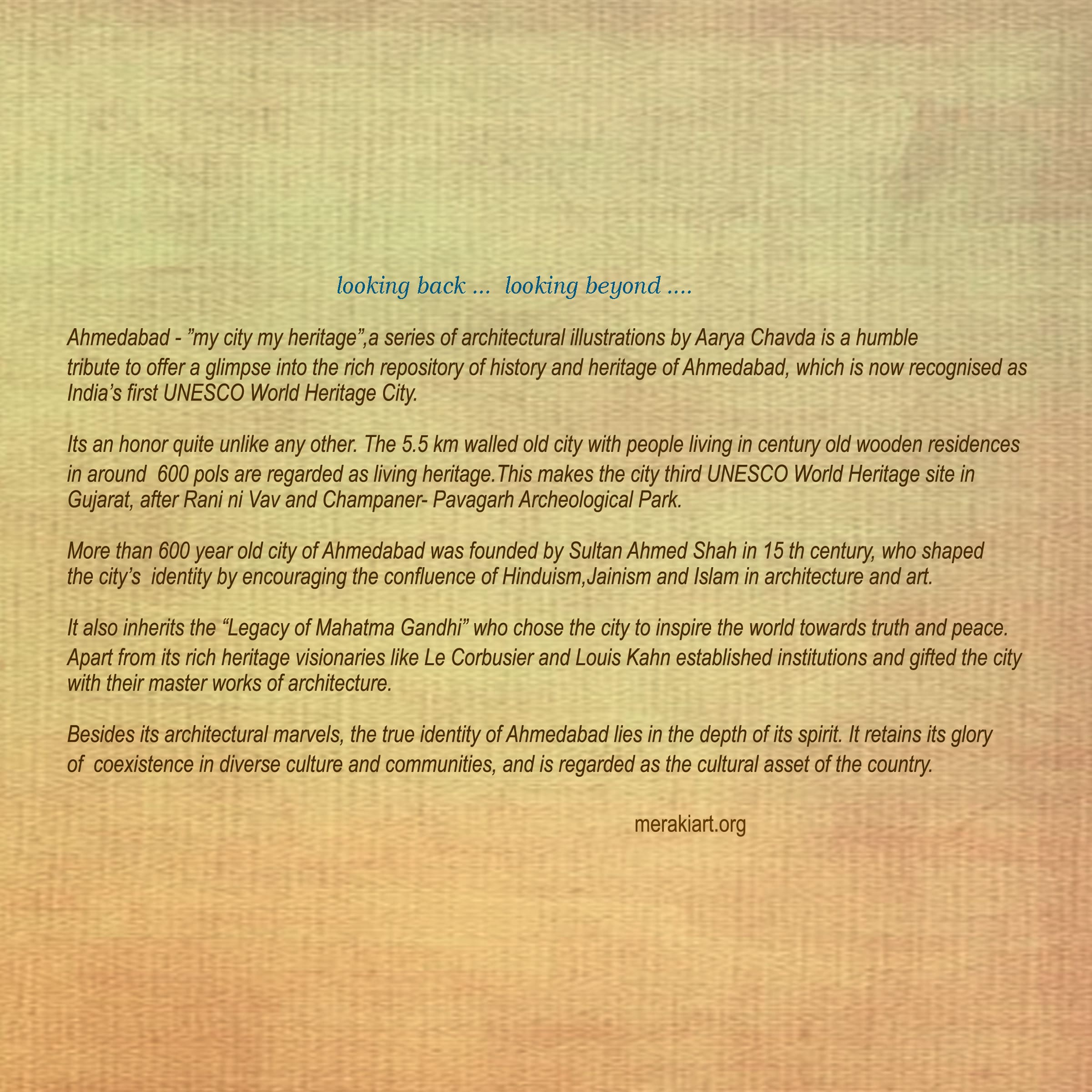 Ahmedabad-“my city my heritage”, a series of architectural illustrations by Aarya Chavda is a humble tribute to offer a glimpse into the rich repository of history and heritage of Ahmedabad, which is now recognized as India’s first UNESCO World Heritage City.