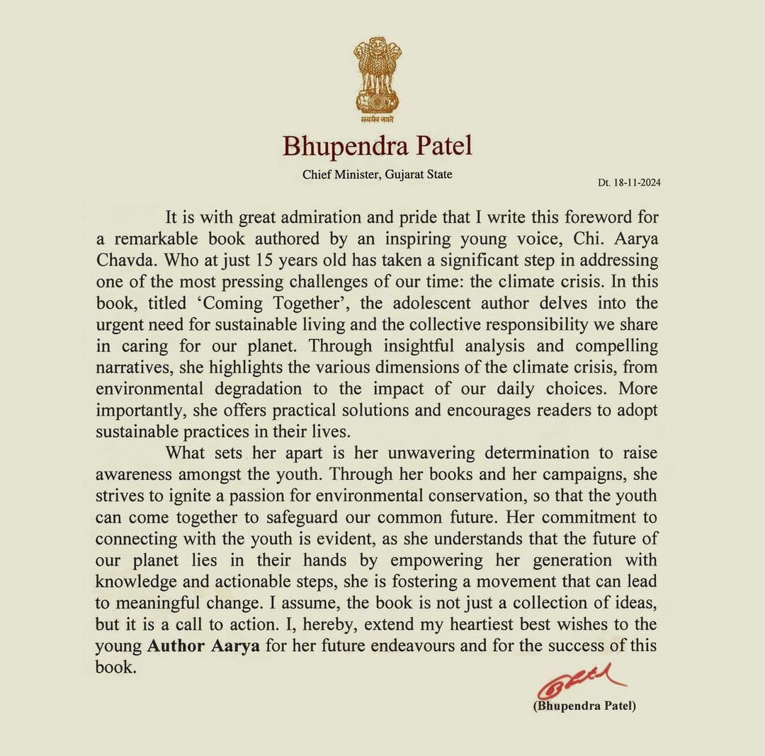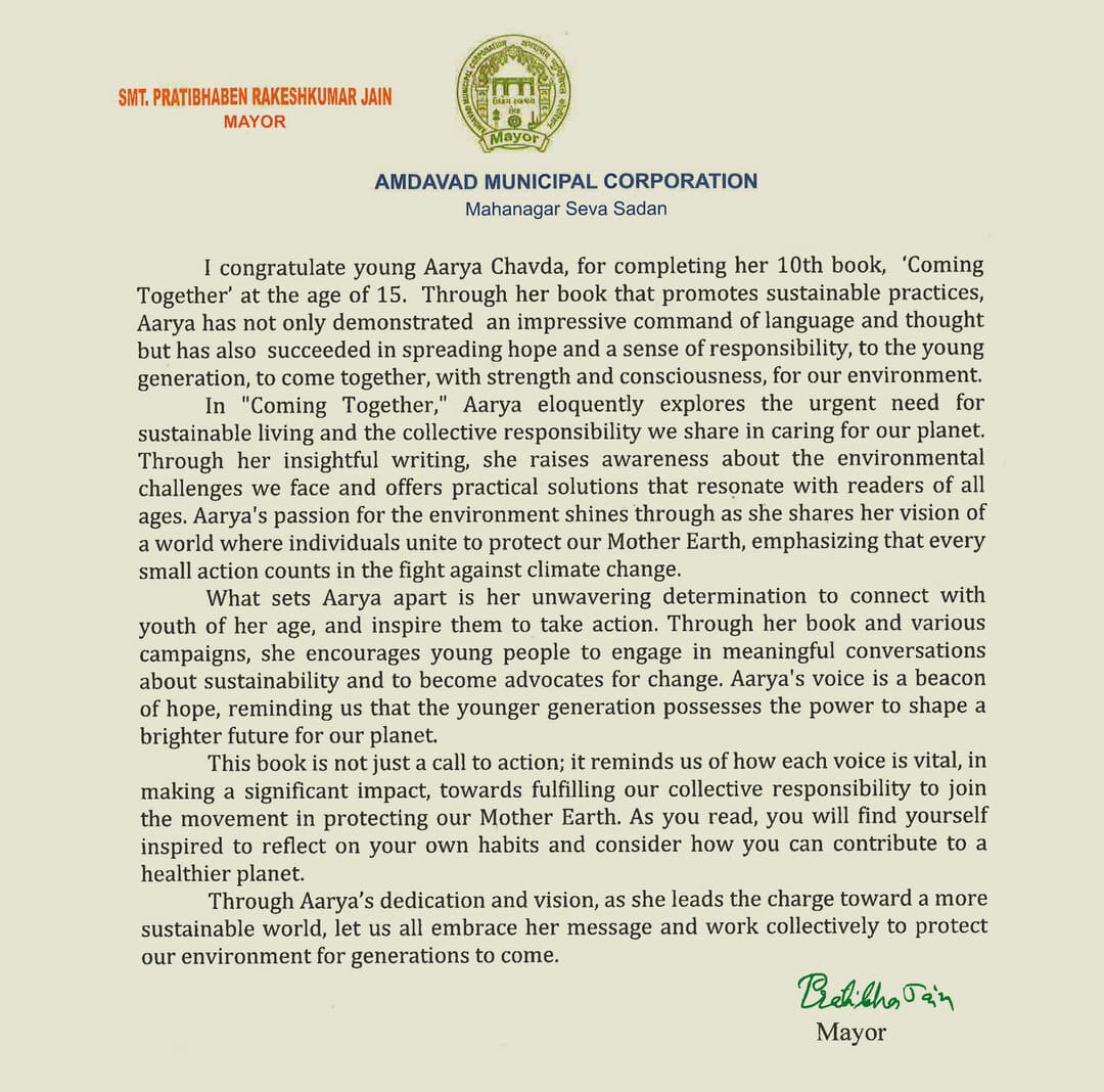 Aarya’s 10th book ‘Coming Together’ was launched at the momentous three-day ‘International Conclave 2023’, in London, UK, in the esteemed presence of Members of the Parliament, Mayors, Assembly Members, and distinguished dignitaries of Indian Diaspora. Aarya delivered a 9 minute speech on mitigating climate crisis during her book launch; and was honored with prestigious ‘Global Gandhi Award 2023’ held at the UK Parliament’s House of Commons.